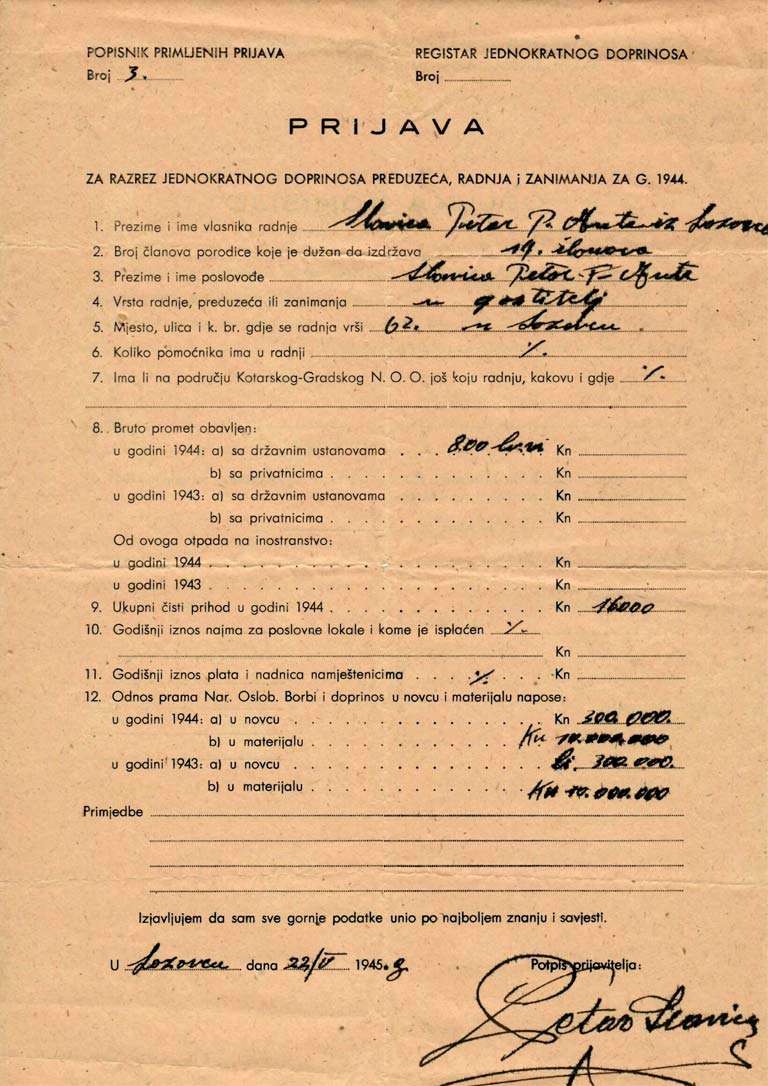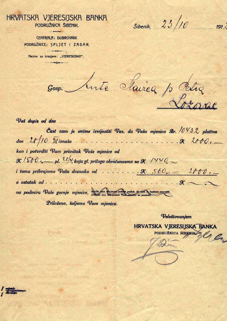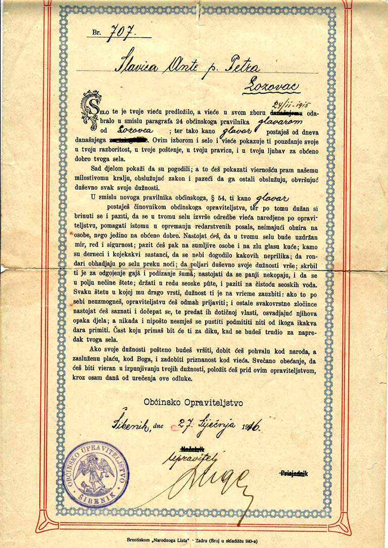 Pogledajte zanimljive dokumente iz obiteljske arhive: imenovanje glavarom, mjenica iz 1912. godine, iskaznica od Trgovačke komore Zadra iz 1906., Prijava poreza na dohodak za 1944. godinu i druge zanimljivosti iz prošlosti.